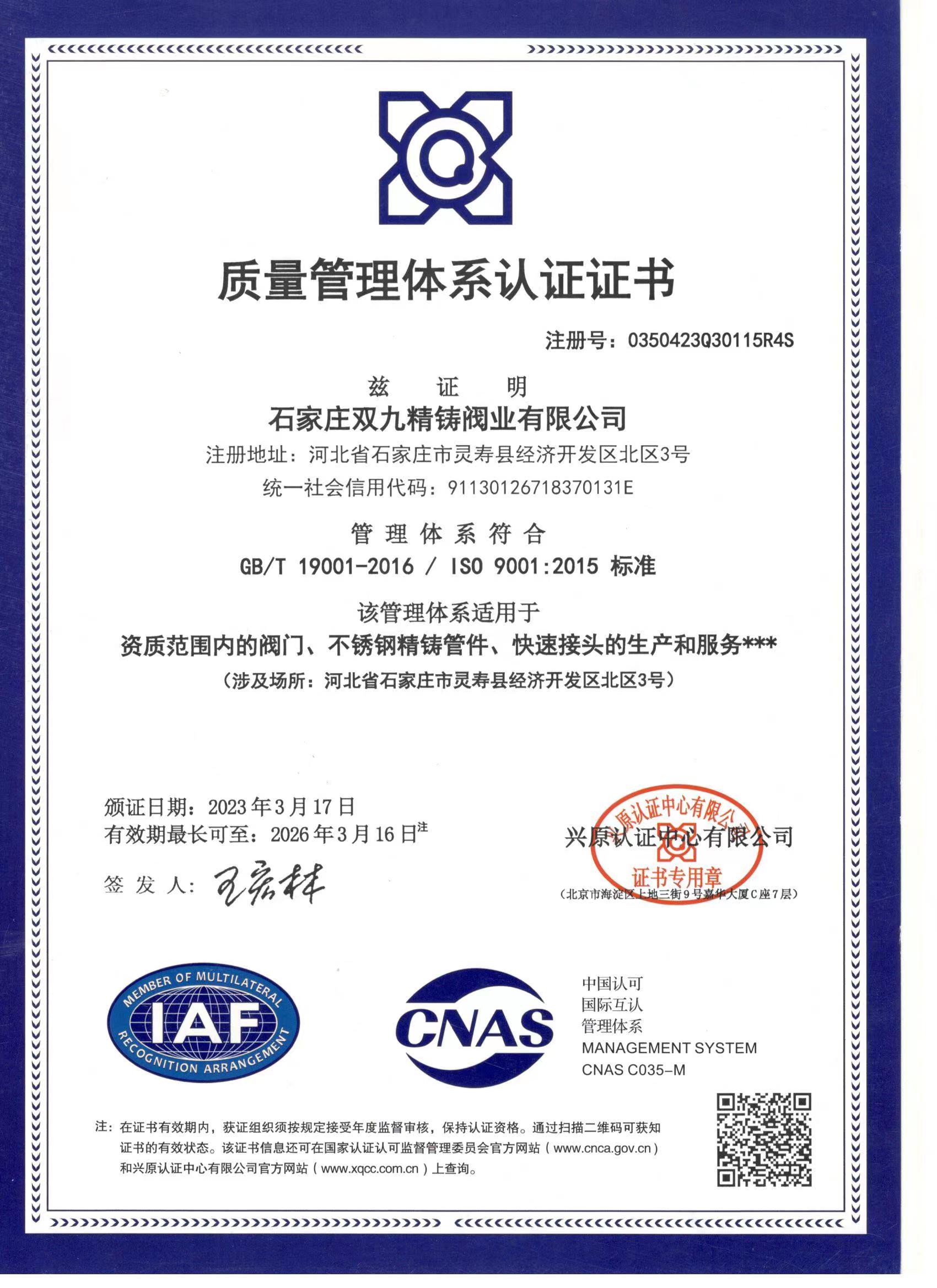 石家莊雙九精鑄閥業(yè)有限公司成立于1999年,是一家集科研加工,生產(chǎn)銷售于一體的高新技術(shù)企業(yè)。本公司專業(yè)生產(chǎn)精鑄不銹鋼閥門、管件、快速接頭、鐵路機車配件等產(chǎn)品,廣泛應(yīng)用于石油化工、冶金、建筑、醫(yī)藥、食品、燃氣、電子、運輸?shù)阮I(lǐng)域。